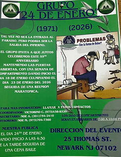 Grupo 24 de Enero Ciudad de Newark New Jersey (7 South St. Esquina con Pennsylvania Ave,Newark, NJ 07102) El grupo estara celebrando su aniversario numero 55 de tener sus puertas abiertas, para esta celebracion contaran con una semana de compartimiento iniciando el dia 18 de Enero hasta el dia 23 de Enero del 2026, seguida de una reunion maratonica el dia Viernes 23 de Enero. Las reuniones se llevaran acabo en el local (5 Thomas St Newark, NJ 07102) en los horarios de 7pm a 10pm. Finalizando el dia 24 de Enero con su reunion de informacion al publico en la direccion (25 Thomas St Newark, NJ 07102) El horario del evento sera desde las 4:30pm en adelante.